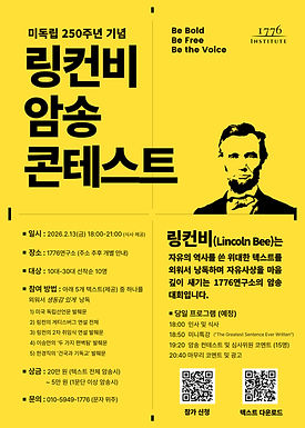 '링컨비' 암송 콘테스트 참가자를 모집합니다. '링컨비'는 자유의 역사를 쓴 위대한 텍스트를 외워서 낭독하며 자유사상을 마음 깊이 새기는 1776연구소의 암송대회입니다. (모집마감)